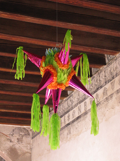 Source: WTL© digital photograph taken on site at the former monastery of San Agustín Acolman. Comment and Question: Close-up of a piñata at Acolman. How many "stars" does this piñata have? Hint: one is almost out of view. What occurs to you concerning the traditional number of the piñata's stars? |