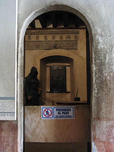 Source: WTL© digital photograph taken on site at the former monastery of San Agustín Acolman. Comments: We shall now visit the interior where the monks lived, worked, and prayed. This photo is meant to be a modern entrance into a humanities site of the distant time and place. Question: Does this photo work to fulfill this intention? Embedded image: To see this museum's set-up of a monk's cell, see: => Acolman #10a. |