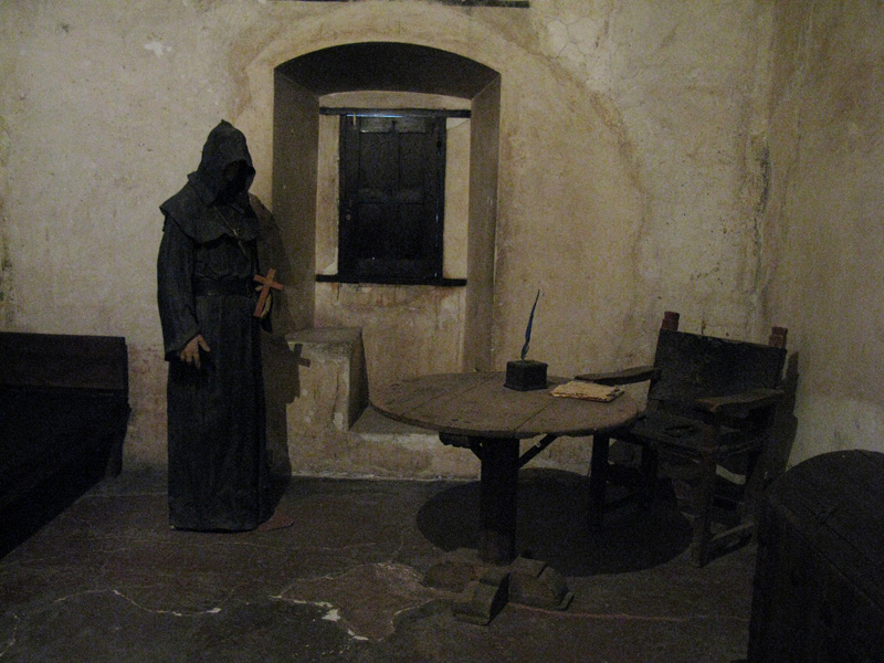 Source: WTL© digital photograph taken on site at the former monastery of San Agustín Acolman. Comments: This room served the purpose of allowing monks to sit in the niche next to the standing model of a monk, open the wood window next to the sitting place and speak to a visitor on the outside. The Augustinian Order is a religious order of the Roman Catholic church that follows a rule of community life based in the sermons of Saint Augustine of Hippo, most especially inspired by a letter he wrote to a community of women in 423 C.E. The order was officially constituted in the 13th century. Augustinian communities' rules were less rigid than those of the strict monastic orders. |