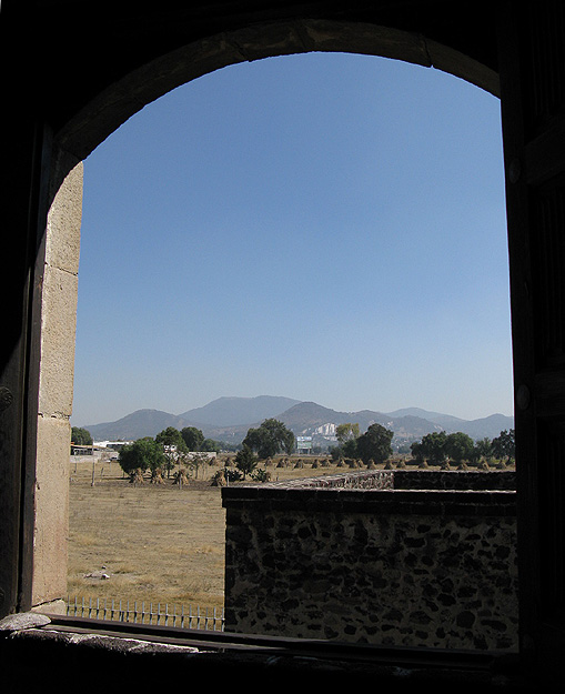 Source: WTL© digital photograph taken on site at the form convent of San Agustín Acolman. Comments: Lookig through a window on the second floor at the back of building we look out toward the countryside surrounding the convent. At the foreground right is the terrace from which we looked at the back of the building in the last image. |