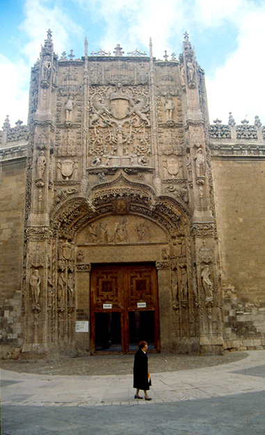 Source: WTL digital photograph taken on site in Valladolid, Spain. Comment: Here is the core of the Plateresque façade of the Colegio de San Gregorio and the main entrance to the museum. I took this photo with a wide-angle lens in order to get the entire façade in the frame at close range (my back is up against a building behind me). It was built between 1488 and 1496. This architectural style is the quintessence of Plateresque style (i.e., the intricate style used by expert silversmiths). |