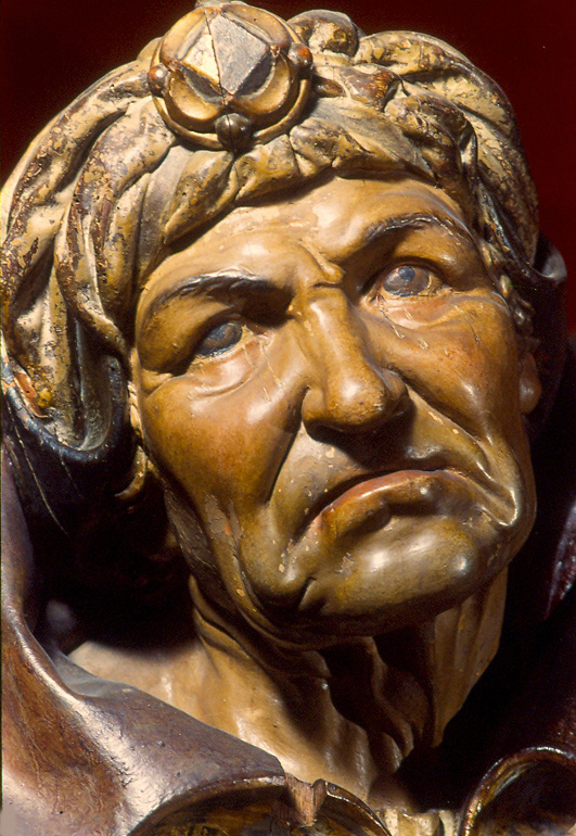 Source: WTL digital photograph taken on site in Valladolid, Spain. Comment: Detail of the head of St. John from the sculptural scene seen in the last image (San Gregorio #5). Humanities Question: Describe five major aspects of this sculpture in terms of Hispanic culture, the time it was created, and the style. |