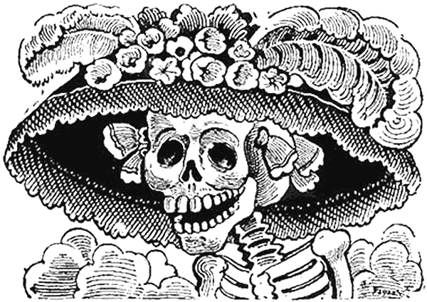 Comments: This female skeletal figure is known throughout Mexico as la Catrina (the "lady dandy"). Etching by José Guadalupe Posada, la Calavera Catrina (1913). The figure is emblematic of the art of Mexico in general and, more specifically, of the Day of the Dead (Día de los Muertos or Día de Difuntos); that is November 2nd. In Latin America and some other countries with prominent Catholic populations, it is a religious holiday where family pray for and have celebratory meals or parties for deceased family members. November 1st is All Saints' Day (Todos los Santos) and the following day, in English, is All Souls' Day. In Mexico, as Posada's emblematic image above suggests, people construct elaborate private altars with flowers, food, drinks, sugar candies in the form of skulls, and they visit the cemeteries where their family members are buried. Halloween (All Hallows Even or Evening) in English-speaking countries is related, but, generally speaking the traditions are celebrated in somewhat different ways. In Mexico, the Catholic Church fused the Día de los Muertos with a pre-Columbian festival in which the Aztec goddess Mictecacíhuatl (Aztec goddess who ruled over the Aztec underworld with her twin god, her husband, Mictlantecutli) was honored. This kind of religious and cultural holiday is fairly universal throughout the world's diverse cultures.