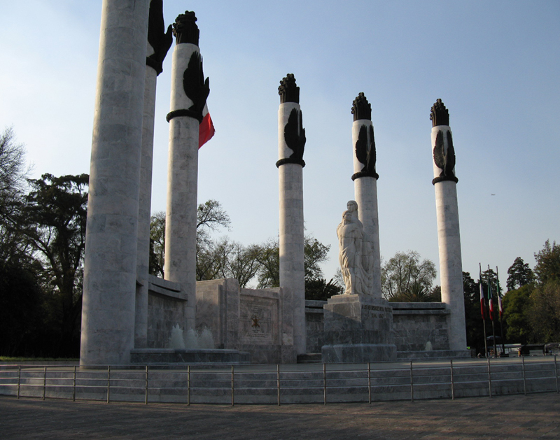 Comments: After visiting the park, I took this photo just before the sun was setting while I was returning to a hotel in the Zona Rosa. This grandiose and patriotic monument at the park's entrance is dedicated to the six Niños Héroes, whose story you can find embedded in the tenth image in the Chapultepec Slide Show (see: => Chapultepec #10). The full name of this monument (1952) is the Monumento a los Niños Héroes (Altar a la Patria) [Monument to the Boy Heroes (Altar to the Homeland)]. It is the work of the Ernesto Tamariz (sculptor) and Enrique Aragón E. (architect). Every year on September 13th a ceremony is held in which the names of the six boys are read. For Mexican national consciousness, the boys represent a moment in Mexican history and on-going Mexican national political myth.