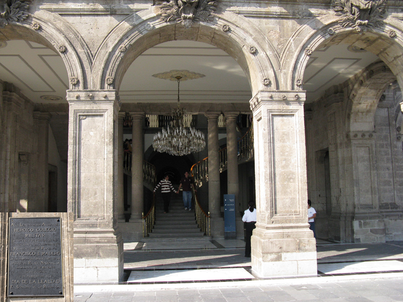 Comments: Inset at the lower left of this photograph is a plaque that is affixed to the building just to this monumental entrance. It says in Spanish: "A la lealtad de los alumnos del Heroico Colegio Militar quienes el 9 de febrero de 1913 custodiaron al ciudadano Presidente de la República Francisco I Madero en la marcha que, desde este lugar, efectuó al Palacio Nacional, en afirmación de su mandato institucional / 9 de febrero de 1973 / "Día de la Lealtad" / El Gobierno de la República". (To the loyalty of the cadets in the Heroic Military Academy who, on February 9, 1913, formed the honor guard for citizen and President of the Republic Francisco I. Madero, who, from this place, marched to the National Palace in confirmation of his institutional mandate / February 9, 1973 / Day of Loyalty / The Government of the Republic.)
