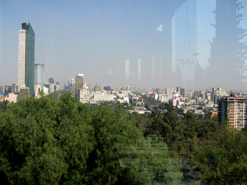 Comments: Looking through an outdoor window (see the reflection) toward the east, we see the end of Chapultepec Park and the Paseo de la Reforma on the left and the historical core of the city just out of view to the right . (This photo was taken on an unusually clear day.)