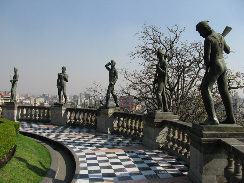 Comments: These five bronze statues and the one just behind the photographer are placed on the edge of Chapultepec Hill at the location where the six heroic cadets jumped to their deaths on September 13, 1847, rather than surrender to the invading U.S. forces in what is known as the Battle of Chapultepec. Rather than retreat as their generals Nicolás Bravo and José Mariano Monterde had ordered them, they wrapped themselves in the Mexican flag to keep it from falling into the enemy's hands. The six boy cadets are: