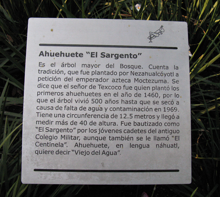 It is the oldest tree in the [Chapultepec] Forest. According to tradition, it was planted by Nezahualcóyotl following a request by the Aztec emperor Moctezuma. It is said that the Lord of Texcoco was the man who planted the first ahuehuetes in the year 1460; thus the tree lived 500 years until it dried due to a lack of water and pollution in 1969. It has a circumferance of 12.5 meters, and it attained a height of more than 40 m. It was baptized as "The Sargent" by the cadets in the old Colegio Militar (i.e., military prep school), although it was also called "The Centinel." Ahuehuete, in the Náhuatl language, means "old man of the water."