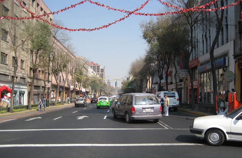 Source: WTL photo© on site in Mexico City, December, 2008. Image: Looking down the commercial street, Calle 20 de Noviembre, directly toward the Zócalo (central square) and the Catedral Metropolitana. Comments: Using the complicated rhetorical device of hyperbolical litote (look us the meaning of these words), there are more than twenty-four million important aspects of the humanities to be illustrated, analyzed, discussed, questioned, pondered, etc., in Mexico City, but, in this course there is only limited time and just enough server space to evoke the complexity and confusion and magnificence of this the world's largest city. We shall start, here, then, within a couple of blocks of the center of the metropolis, the power center of the country, and once upon a time it was the supposed axis mundi. We shall start simple, with a branch of a Mexican bank, Banamex on the corner on the right, a couple of blocks of simple stores, cars including the green and white taxi (the professor-photographer was toreando coches at the risk of his life), one of the (in)famous VW Bug peseros, a few pedestrians here and many more farther down the street, and a couple of kids on bicycles. Welcome to Mexico City. ¡Bienvenidos a México! (Generally speaking, Mexicans refer to Mexico City not as la ciudad de México, but just as México.) Humanities topic: You can see hints in the street decorations in this image of holiday decorations. What major Mexican holidays are celebrated in December? Note: Mexicans spell their country and city with an "x," but Spaniards spell both with a "j." Can you explain the difference? Mexicans are "right," and Spaniards are "wrong," but in one sense both are right. What's going on here? |