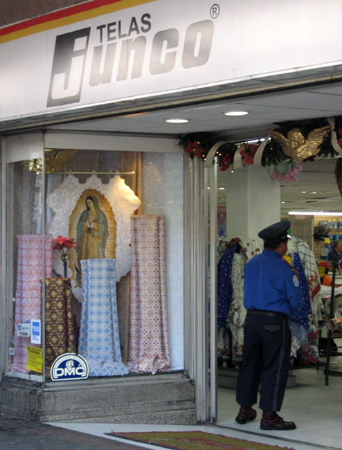 Source: WTL photo© on site in Mexico City, 2008. Image: Walking toward the Zócalo (see the last page:<= Mexico City #1), the professor-photographer stops in front of this store Telas Junco: Junco is the name of the store's proprietor; hence, the store is Junco's Fabrics. Comments: Naturally, he waited for the policeman to turn away from the camer to take this photo (it's illegal to photograph security personnel in Mexico due to the universal nervousness caused by the terrible drug war violence that grips parts of Mexico). Humanities topics: (A) Comment on the juxtaposition of the security guard and items in the showcase window (la vitrina); (B) Why would this typical shop—this image is typical of thousands of stores throughout Mexico—show that particular image among a display of fabrics? Hint: Where have you seen this image before in this textbook? |