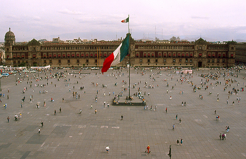 Source: WTL digitized slide photo© on site in Mexico City, 1973. Comments: The Palacio Nacional (national government building), with the national flag of Mexico in the center, was first called the Plaza Mayor, then the Plaza de Armas (Place d'Armes in French, right?). The official name of the square is the Plaza de la Constitución, referring to the liberal Spanish Constitución de Cádiz of 1812. The Spanish word (from Arabic) zócalo refers to the base of a monument; the 19th century monument proposed by General and President Santa Anna was never built, but the word stuck in popular parlance. For a somewhat related 19th century painting in this course, see: => Ejército Triganante / Triumphal Entry. During the Colonial period, this building was the Royal Palace of the viceroys (Real Palacio or Palacio de los Virreyes). Immediately before the Conquest, Moctezuma's palace was were the Palacio Nacional now sits. Basically, the building conforms to the original sense of a medieval fortress, but the overall effect is that of a Neo-Colonial building. The top floor was added in the 1920s. Behind the flagpole is the balcony from which President of the Republic addresses the people of Mexico every Independence Day. In the patio behind the entrance portal on the left are Diego Rivera's famous murals: Epopeya del pueblo mexicano (Epic of the Mexican people). Additional views of the National Palace: See: => Mexico City #04; => Mexico City #04b; => Mexico City #04c. Humanities topic: Compare and contrast this building with these Latin American buildings: => National Palace, Lima; => Palacio Legislativo, Montevideo; => Congresso Nacional, Brasília; and => Palacio Nacional, Guatemala City. |