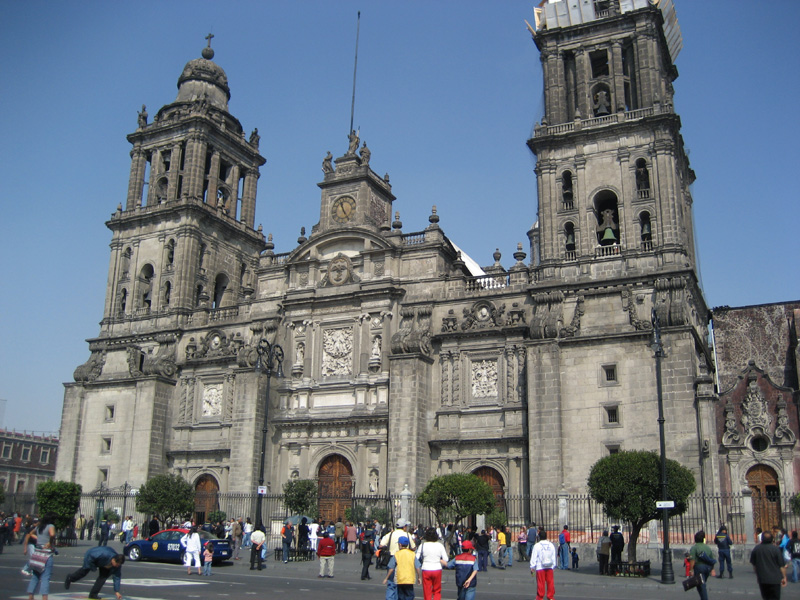 Source: WTL photo© on site in Mexico City, 2008. Other images: See: => Mexico City #5; => Mexico City #5b; and => Mexico City #5c. Comments: This façade is essentially due to late Spanish Renaissance style of Herrera. The Cathedral is dedicated to the Assumption of Our Lady (la Asunción de Nuestra Señora or La Asunción de María), whose symbol can be seen in the rectangular light colored bas relief above the central entrance. On either side of the main entrance door are statues dedicated to Saint Peter (San Pedro; hidden by a tree on the left) and Saint Paul (San Pablo) on the right. At the top of the short tower in the middle at the top above the clock are three statues dedicated to the three theological virtues (Faith, Hope, Love—also known as Caritas or Charity). Humanities topic: Compare and contrast the façade of this cathedral to parallel buildings in these cities: => Havana; => Guatemala City; => Lima; => Rio de Janeiro; and => Brasília. |