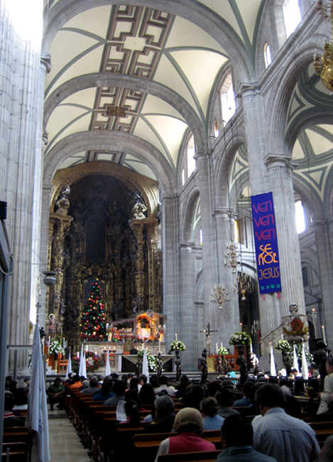 Source: WTL photo© on site in Mexico City, 2008. The other images: See: => Mexico City #5; => Mexico City #5a; and => Mexico City #5c. Comments: Here you see the Neoclassical central nave inside the sanctuary. In the background is the baroque altar mayor (high altar) The banner on the right says: Ven, ven, Señor Jesús (Come, come, Lord Jesus). Humanities topic: Name two significant differences between the style of the high altar on the one hand and the columns and ceiling of the nave on the other hand. |