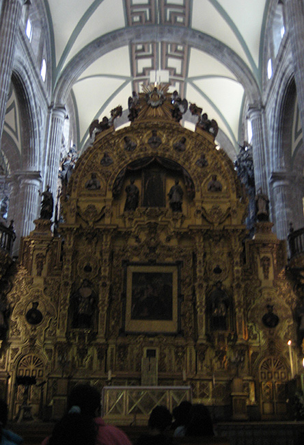 Source: WTL hand-held digital photo© without flash on site in Mexico City, 2008. The other images: See: => Mexico City #5; => Mexico City #5a; and => Mexico City #5b. Comments: Behind this altar (this photo is not showing detail of the high altar, although, at first glance, it may appear to be so) is the choir, which, according to Medieval and Renaissance Spanish church tradition, is located toward the middle or the back of the central nave. When the professor-photographer took this hand-held photo (flash is forbidden in this and many other cultural monuments), people were gathering for a mass that was going to be held in front of this altar. Out of respect for the congregants, he tried to aim mostly above the heads of those present. Humanities topic: Identify and describe the style of this altar. |