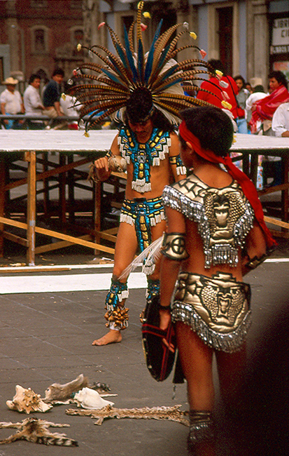 Source: WTL photo© on site in Mexico City, 2008. Image: Close-up of two of the Aztec danzantes seen in the previous page who are performing around some totemic objects. Comments: Some danzantes are Náhuatl-speaking descendents of the Aztecs, others are not. Additional views: See: => Mexico City #9; => Mexico City #9b; => Mexico City #9c. |