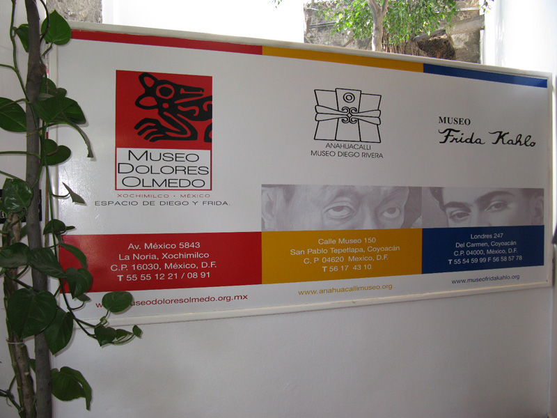 Source: WTL photo© on site in Mexico City, 2008. Image: Sign at the entrance to the Museo Dolores Museo, in Xochimilco near Mexico City. Comments: As you can see, this museum also publicizes museums dedicated to Diego Rivera and Frida Kahlo. This museum houses important works by both of these Mexican artists and others including works by Angelina Beloff, a Russian artist who was also Diego Rivera's first wife. It also contains over 600 pre-Columbian pieces and many objects frm the Colonial period. Brief image tour of the Museo Dolores Olmedo: See: => Mexico City #26a; => Mexico City #26b; => Mexico City #26c. |