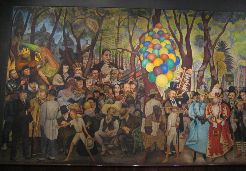 Source: WTL photo© on site in Mexico City, 2008. Image: Diego Rivera mural: Sueño de una tarde dominical en la Alameda / Dream of a Sunday Afternoon in the Alameda Park (1947-1948). For enlarged detail of the far left of this image, see: => Sueño Mural E. Comments: Detail of approximately the left one-third of the mural. On the extreme left is a scene of the Spanish colonial Inquisition, where heretics were burned at the stake (the Alameda Park is the original site of such executions). The large head to the left of the balloons is Benito Juárez, the hero of Mexican independence from the French in the middle of the 19th century. Sor Juana Inés de la Cruz can be seen just to the right of the figure with the flayed back next to the Inquisition scene. In 1592, the viceroy of New Spain, converted the space occupied by the park, which was once an Aztec market place, into a public park. Nowadays in La Alameda Park is the grand monument (also called the Hemiciclo or hemicycle) dedicated to Benito Juárez, directly facing Avenida Juárez. Humanities topic: Given this mural's title, what kind of "Sunday afternoon in the park" is Rivera depicting in this part of the mural? Study the mural with this series of photos: => Sueño Mural A; => Sueño Mural C; => Sueño Mural D; => Sueño Mural E; => Sueño Mural F; => Sueño Mural G; => Sueño Mural H. |