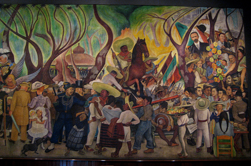 Source: WTL photo© on site in Mexico City, 2008. Image: Diego Rivera mural: Sueño de una tarde dominical en la Alameda / Dream of a Sunday Afternoon in the Alameda Park (1947-1948). For an enlargement of the scene around the man on the horse, see: => Sueño Mural G. For detail of the extreme right side, see: => Sueño Mural H. Comments: Approximately the right one-third of the mural, with overlapping on the left side from the previous page. Among the identifiable figures on this the right side of the full mural is the Revolutionary hero Emiliano Zapata riding the rearing horse. The man in the black suit holding a top hat in the upper right is Francisco I. Madero, the short-lived elected president of Mexico at the beginning of the Mexican Revolution. Just below him is a smaller figure with a mustache in a light green jacket is Francisco (Pancho) Villa, the Revolutionary leader of the armies of northern Mexico. Humanities topic: This right segment of the mural constitutes Rivera's depiction of Mexico from Porfirio Díaz through the Mexican Revolutionary period up until the 1940s. Keeping in mind the background against which the figures are placed, overall, what is Rivera saying about this period of Mexican history and society? Study the mural with this series of photos: => Sueño Mural A; => Sueño Mural B; => Sueño Mural C; => Sueño Mural E; => Sueño Mural F; => Sueño Mural G; => Sueño Mural H. |
