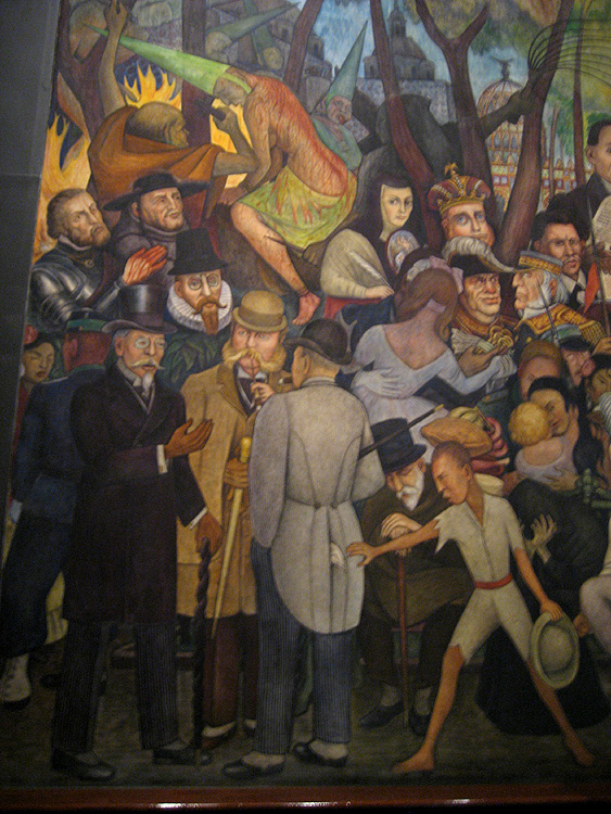 Source: WTL photo© on site in Mexico City, 2008. Image: Diego Rivera mural: Sueño de una tarde dominical en la Alameda / Dream of a Sunday Afternoon in the Alameda Park (1947-1948). Comments: Enlarged detail of the extreme left of the mural. Humanities questions: (A) Find Sor Juana in this part of the mural and describe both (a) the context in which she is placed and (b) a few aspects of anachronism; (B) How would you describe the style or art movement or aesthetics of this part of the mural? Study the mural with this series of photos: => Sueño Mural A; => Sueño Mural B; => Sueño Mural C; => Sueño Mural D; => Sueño Mural F; => Sueño Mural G; => Sueño Mural H. |
