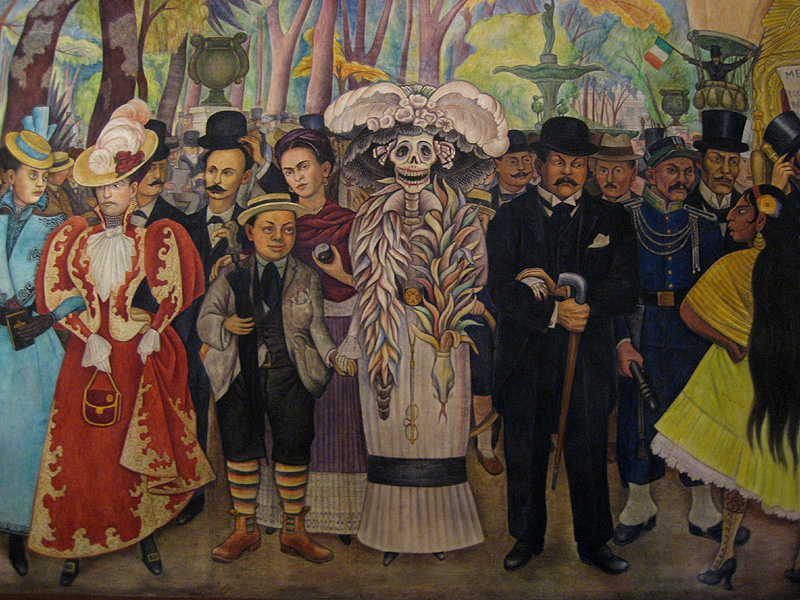 Source: WTL photo© on site in Mexico City, 2008. Image: Diego Rivera mural: Sueño de una tarde dominical en la Alameda / Dream of a Sunday Afternoon in the Alameda Park (1947-1948). Comments: Enlarged detail of the center of the mural. Study the mural with this series of photos: => Sueño Mural A; => Sueño Mural B; => Sueño Mural C; => Sueño Mural D; => Sueño Mural E; => Sueño Mural G; => Sueño Mural H. |