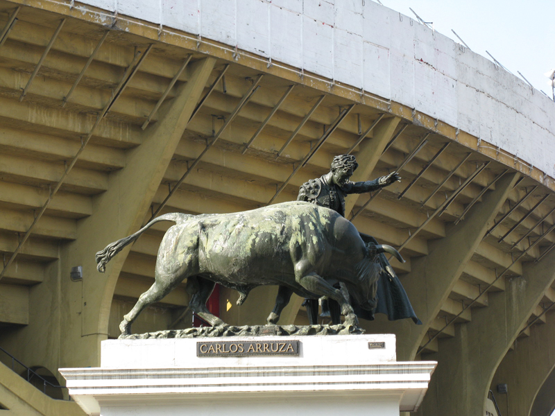 Source: WTL photo on site in Mexico City, 2008. Comments: Ringing the plaza de toros are bronze monuments celebrating famous matadors, such as Carlos Arruza (1920-1966), who was one of the greatest and bravest of all Mexican bullfighters. He was known as "El Ciclón" (Hurricane). Other matadors honored with statues around the arena are Juan Silvetti (Mexico), Joselillo (Spain), and Antonio Fuentes (Spain). |