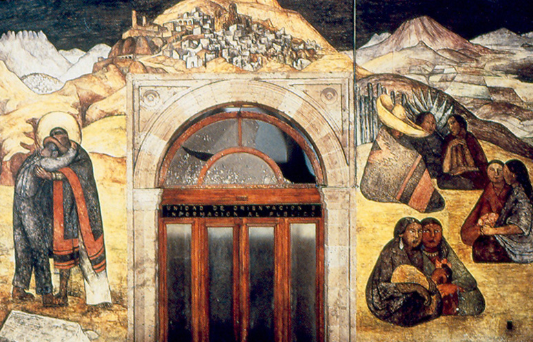 Source: WTL research files. Mural: "Embrace and Peasants" (1923) in the Court of Labor in the Secretaría de Educación Pública, Mexico City. Fresco with nopal juice. Comments: For brief comments on the technique used at the beginning of his mural project at the Ministry of Public Education, see: => Self-Portraits #3. The object of the murals in this national ministry was to give an overview of the resurgence of the Mexican people following their supposed victory in the Mexican Revolution. Rivera and other Mexican intellectuals were fully conscious of the need to connect twentieth-century Mexican culture and humanities with their roots in the Mexican peoples and their pasts. This included the rebirth of mural art. This is the site of Rivera's second mural project. An art critic says this about these murals: Rivera's work here is "a tour de force as an architectural and pedagogical decorative program and the primary element of a three-part artistic source from which the Mexican Mural Renaissance derived much of its formal character and its humanistic-nationalistic direction." Founders Society Detroit Institute of Arts, Diego Rivera; a Retrospective. New York: W.W. Norton & Company, 1986, p. 242. Question: How does this mural surrounding a door in the Court of Labor depict work, labor? |