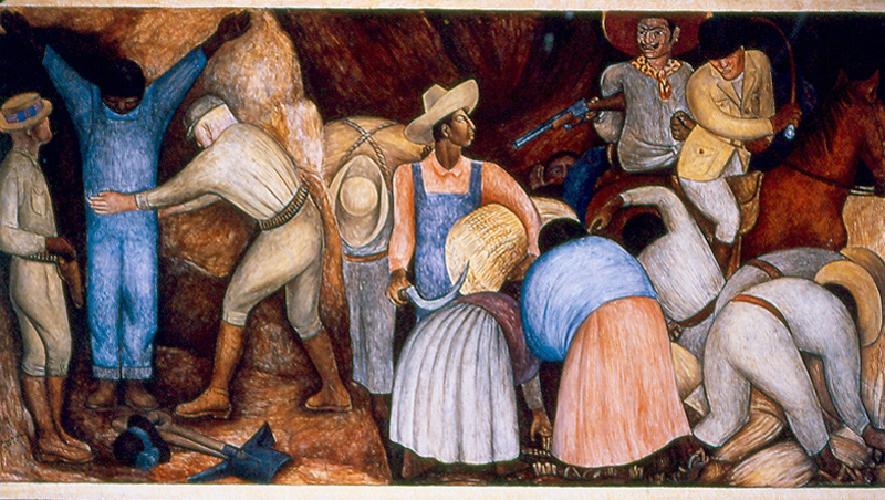 Source: WTL research files. Mural: "Formation of Revolutionary Leadership" (1926-1927), in the chapel at the Universidad Autónoma de Chapingo. Comments: In 1926 and 1927, Rivera undertook murals at this Mexican public university; he painted nude canvases of his pregnant wife (he separated from her in 1926); and he was involved in political activity protesting the American intervention in Nicaragua. In this mural, Rivera is underscoring the solidarity between workers and peasants in what Rivera saw as a class warfare or the struggle between social classes. Critical Observation: Rivera's murals in this chapel "constitute a scholastically reasoned curriculum, following the principles of dialectical materialism, aimed at eradicating the people's memory of past subservience and backward ways by substituting images that present Marxist revolutionary doctrines and advanced technology as the assured pathway to social and economic emancipation" (Diego Rivera, 1986, p. 254). Humanities Questions: (A) Can you identify the workers, the peasants, the boss, and the boss's enforcer (do your best by suggesting concrete answers)? (B) Can you identify the value of colors and the interplay between the figures (do your best by suggesting concrete answers)? (C) Is there æsthetic (i.e., artistic) balance in this mural? (D) What is "dialectical materialism" and what do you think about this ideology (relate your answer to Diego Rivera and the Mexican context in which he painted this mural? |