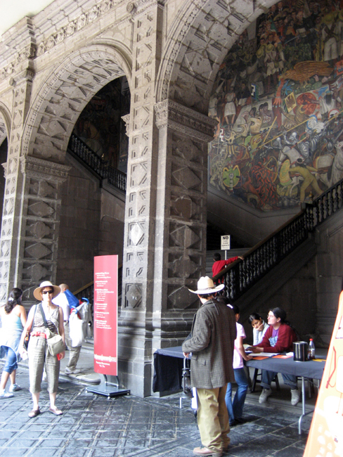 Comments: Here you see tourists at the base of the main stairway with the monumental Diego Rivera's mural rising above us as we ascend the stairs.