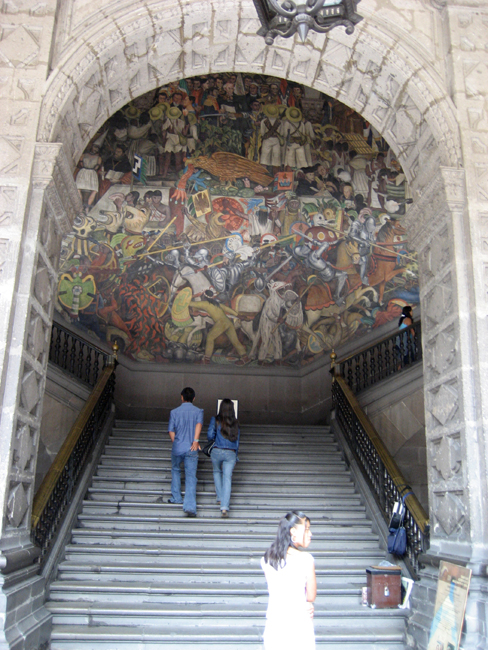 Source: WTL digital photograph taken in the Palacio Nacional, Mexico City. Comments: On August 18, 1929, three days before he married Frida Kahlo, Diego Rivera began painting his murals in the Palacio Nacional. A month later he was expelled from the Mexican Communist Party precisely because he was working on commissions he received from the national government and because he was just named Director of the Academia de San Carlos. In September he was hospitalized due to stress and overwork. Meanwhile, however, he was commissioned by the U.S. ambassador to Mexico, Dwight W. Morrow to paint murals at the Palacio de Cortés in Cuernavaca (<= Palacio de Cortés #8), in which he depicts the history of the State of Morelos from pre-Columbian times to the 1910-1920 Revolution. Rivera completed the giant murals in this stairwell in 1935. |