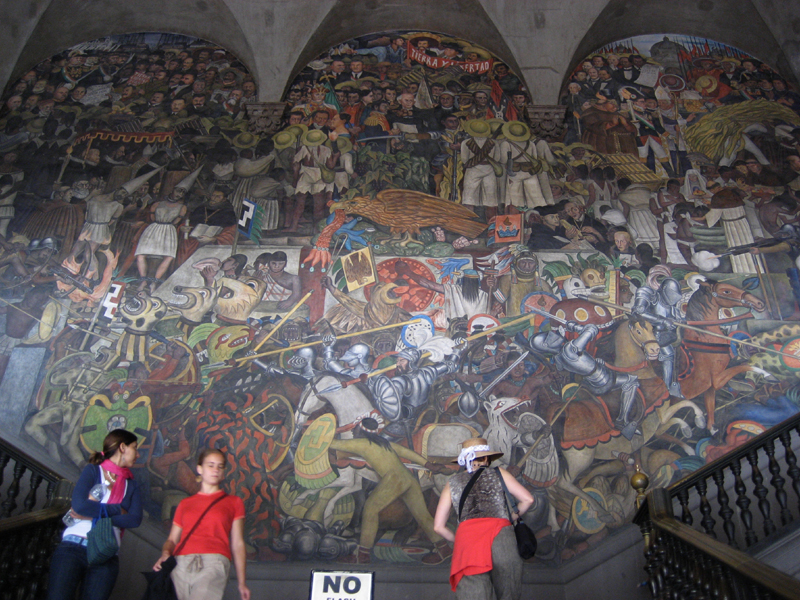 Source: WTL digital photograph in the main stairwell of the Palacio Nacional, Mexico City. Comments: The full title of the entire mural project in the Palacio Nacional is: "History of Mexico from the Conquest to the Future" (1929-1930). Here we are looking at the west wall. At the lower center, just above the native Mexican in olive green outfit is Hernán Cortés on horseback with iron armor, lance, and plumed helmet. Just above Cortés is Cuauhtémoc, the last emperor of the Aztecs and the main defender of Tenochtitlán, with stylized Jaguar mask. And above Cuauhtémoc is an eagle with a serpent in its mouth, emblem of Mexico par excellence. Other images in this part of the west wall include: Inquisition agents to the left; Fr. Miguel Hidalgo in the upper right; Emiliano Zapata in the upper center (above the word "Tierra"); La Corregidora (Doña Josefa Ortiz de Domínguez, of independence fame, to the left side of the upper middle arch); and Benito Juárez, to the left side of the upper right arch). Humanities Questions: How would you describe the style and content of this mural? |