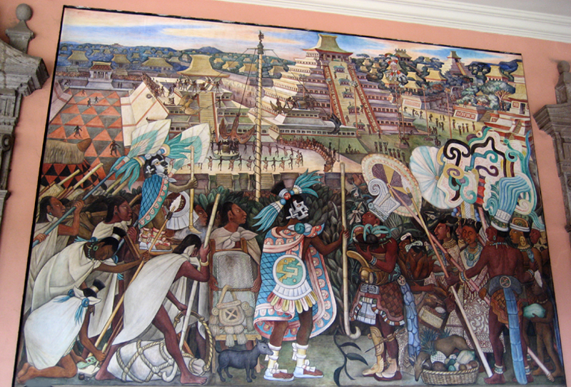 Source: WTL photograph taken on the patio corridor of the Palacio Nacional, Mexico City. Comments: This mural panel depicts the Totonac culture, with the famous Voladores flying from the pole in the center of this colorful scene. For the Voladores seen earlier, see: <= Museo Nacional de Antropología #3. |