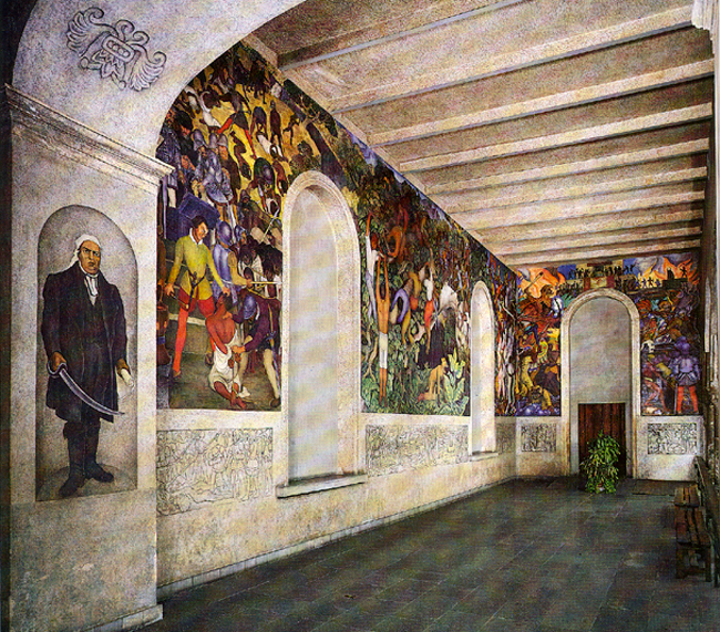 Source: WTL photograph© (1999). Mural: "Battle of Aztecs and Spaniards" (1930), in the Museo Cuauhnáhuac, Palacio de Cortés, in Cuernavaca, Mexico. Comments: As stated before, Diego Rivera's murals in the Palacio de Cortés were commissioned by the U.S. Ambassador to México, Dwight W. Morrow, who was one of the most talented, liked, and successful ambassadors the U.S. has ever sent to Mexico. To paint these murals, Rivera interrupted his work on the Palacio Nacional in Mexico City. The murals cover these two walls and the wall behind the photographer (see: <= Cuernavaca #8). The subject is the history of Cuernavaca and the State of Morelos from pre-Conquest times through the leadership of Emiliano Zapata in 1911. On the far left is a mural depicting José Morelos, one of the great leaders of Mexico's War of Independence (1810-1821). On the far right is the battle between Cortés' forces and the Aztecs in Cuernavaca. Then the middle panel on the left is "Crossing the Barranca", a Spanish engineering feat, which enabled the Spanish victory. On the left is "The Taking of Cuernavaca". Other panels behind the photographer include the full defeat of the Aztecs, Bartolomé de las Casas, Morelos, and Zapata. For a complete tour of this mural in series format, see: => Rivera in Cuernavaca. Humanities Question: How do you evaluate the American involvement in creating these murals in the palace-fortress built by and living in by Cortés? |