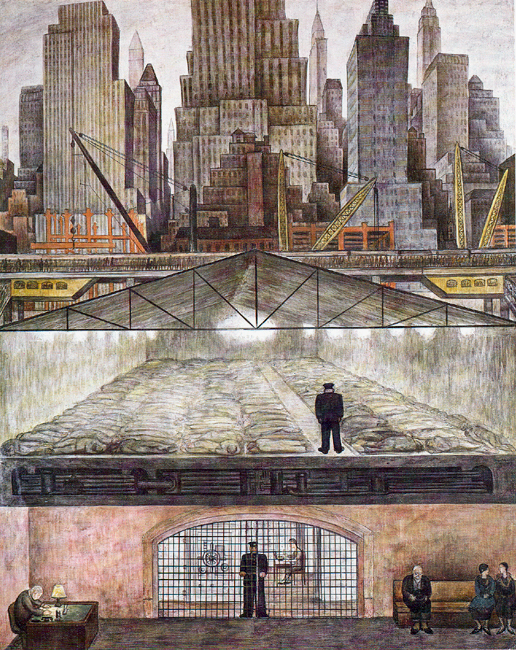 Comments: According to Alicia Azuela (Diego Rivera, 1986, p. 125), "1930 was crucial in the carer of Diego Rivera for it was then that he began the first of seven murals in the United States, all but one inspired by that country's industrial society [... His desire was to] create an art that would treat the machine as both an æsthetic object and a generating force in the process of social change." What you see here is the central painting in a series of seven movable panels shown in a retropective of his work at the Museum of Modern Art (MOMA, NY) in 1931. This panel—a fresco on reinforced steel concrete—shows the grayness of New York City after two years of the Great Depression. On the bottom is a bank vault; in the center are the countless workers' bodies entombed in a bleak warehouse; and the top part shows the lifeless skyscrapers above the surface.