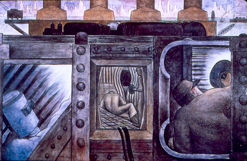 Source: WTL research files. Fresco: "Electric Welding" (fresco on reinforced steel concrete, 1931). Comments: This is the panel immediately to the right of the previous work (<= Diego Rivera, #25). This fresco depicts a scene in an electric power plant. The depiction of machines as æsthetic objects is one of the tenets of a core period and aspect of (European and United States) modern art (1920-1940), of which Diego Rivera was a master. Humanities Questions: What aspects of this fresco communicate the "modernity" the artist is attempting to convey? What aspects of this work are educational? What aspects of this work are art? How does the medium contribute to the essence of this work? |