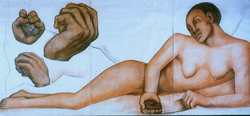 Source: WTL research files. Cartoon: "Figure Representing the Black Race" (1932) in the Detroit Institute of Arts. Comments: This painting is a cartoon created before executing the same fresco on the north wall of the Institute's Garden Court. This same year, Frida Kahlo had a miscarriage at the Henry Ford Hospital; she then returns briefly to Mexico to take care of her sick mother, while he remains in the United States doing murals in Detroit and negotiating a commission to do murals at the RCA building in New York City. For a brief tour in 2009 of the location of Rivera's famous mural (1932), see: => Rockefeller Center Battle. Humanities Question: In this nude cartoon, what comments is Rivera making about the Afro-American people? |