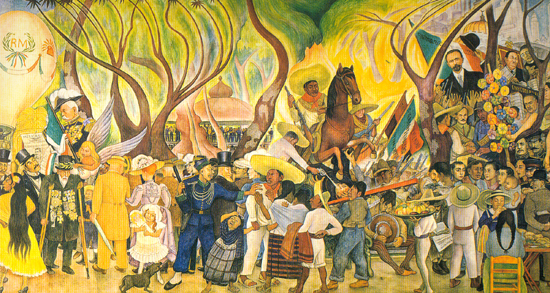 Source: WTL research files. Mural: Right 1/3 of "Dream of a Sunday Afternoon in the Alameda" (1947) in the Hotel del Prado (Hotel Alameda), on the Avenida Juárez, across the street from the Alameda park. Comments: Among the identifiable figures on this the right side of the full mural is the Revolutionary hero Emiliano Zapata riding the rearing horse. Humanities theme: Evaluate this part of the mural as a summation of the works of Diego Rivera. Internet Link. For a fine video and Mexican song showing the full panorama of this mural, see the following website: => El ángel caído. |