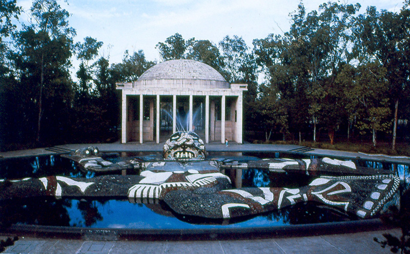 Source: WTL research files. Sculpture: "Tláloc" at the water works at Cárcamo del Río Lerma, Mexico City (1951). Biographical Data: From 1948 to 1951, Diego Rivera finished the mural in the Hotel del Prado (or Alameda Hotel), his petition for readmission to the Mexican Communist Party was denied, he executed more murals in the Palacio Nacional, he lived in the hospital where Frida Kahlo had several spinal operations, he won the Mexican national art prize (el Premio Nacional de Artes Plásticas), and he painted murals at the Lerma water works, which you see here. Comments: This is an outdoor mosaic showing the rain god Tláloc (Chaac) with snakes, fish, and human figures. These water works tap the underground water sources in the Valley of Mexico (el Valle de Anáhuac) giving the Colonia de Polanco (i.e., a D.F. neighborhood) its water supply. The government created this facility for both its water engineering purpose and as a educational site for artists and teachers. There are two parts to the art aspect: a painting on the floor of an open cistern and a large earth sculpture in the water basin. The part of the project that is no longer visible gave the appearance of water gushing from giant cupped godlike hands. Note: For an excellent analysis of this work, see: Diego Rivera, 1986, pp. 325-327. Humanities Questions: How does this mosaic relate to pre-Columbian Mesoamerican civilizations and humanities? (See: <= Notes on the Mayas.) |