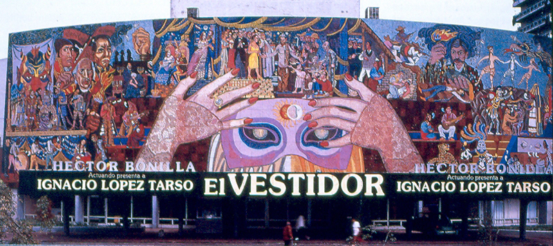 Source: WTL research files. Mosaic: "Popular History" (1953) on the façade of the Teatro de los Insurgentes, Mexico City. Biographical data 1952-1957: In 1952, Rivera creates a very controversial and inflammatory "peace painting"; in 1953, he creates this mural seen here and a number of others; in 1953, he accompanies Frida in her last public appearance in a demonstration against the C.I.A. involvement in the overthrow of the president of Guatemala, Jacobo Arbenz Guzmán, and he is readmitted to the Mexican Communist Party. In 1955, he contracts cancer and seeks a cure in Moscow, where he undergoes an operation and has chimotherapy. In 1956, he travels to Prague, Poland, East Germany, and East Berlin before returning to Mexico, where he surprisingly announces that he is a Catholic, and he compiles inventories for his collections at Anahuacalli and Frida Kahlo's collections in Coyoacán. In 1957, he paints, suffers a paralyzing attack of phlebitis, and dies of a heart attack in his studio in San Ángel, D.F. He is buried in the Rotunda de los Hombres Ilustres in the Panteón de Dolores in Mexico City. In his will he donated all his possessions to the Mexican nation. Comments: This work is in the style of "pop art". In it Rivera demonstrates his love of the comics and buffonery. The subject matter goes from Cortés to the internationally famous Mexican comic actor Cantinflas. Also, we see Aztec rituals and Christians symbols depicted in an irreverent vein. The artistic medium of mosaics contributes to the sense and effect because this mosaic mural glitters when the sun strikes it. The large faces above the conquistadors represent heroes of the Mexican War of Independence and the 19th century reform movement. To the left of the masked face and hands at the bottom we see scenes of Spanish colonial-era oppression, and on the right, once again, we see Aztec religious ceremonies. Humanities Question: What do you think about the hands, eyes, and mask of the masked woman at the bottom center? (Hint: the symbol between the masked eyes is the sun-moon Hindu symbol of karma. ) What is your sense of this work coming near the end of Rivera's life and complete works? |