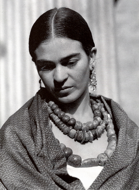Comments: Frida Kahlo was born as Magdalena Carmen Frieda Kahlo Calderón in 1907, Coyoacán, a suburb of Mexico City. Her mother was Mexican (Matilde Calderón), and her father was German (Wilhelm Kahlo). He was a professional photographer. Earlier in 1930, she had suffered an abortion. She died in 1954. The necklaces are pre-Columbian.
