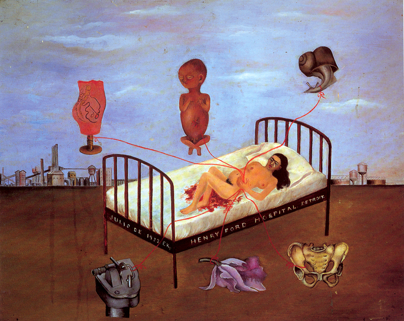 Source: WTL research files. Painting: "La cama volando" (the flying bed) or "Henry Ford Hospital" (1932). Comments: In this painting Frida Kahlo documents her induced miscarriage at the hospital in Detroit. Again we see a textual quality in the painting. Surrounding the floating bed are six symbols and a background representing Detroit industy and the Ford Motor Company's Rouge Plant. This painting shows various elements reminiscent of Salvador Dalí's Surrealism. The subtext is that Diego Rivera was making studies at this automobile plant for murals he was creating at the Detroit Institute of Arts. (For Rivera's Detroit mural, see: <= Diego Rivera #29 <= #30, and <= #31.) Humanities Questions: Can you explain the symbolic objects and the writing on the bed in this painting? What is the ethos she is communicating in this self-portrait? |