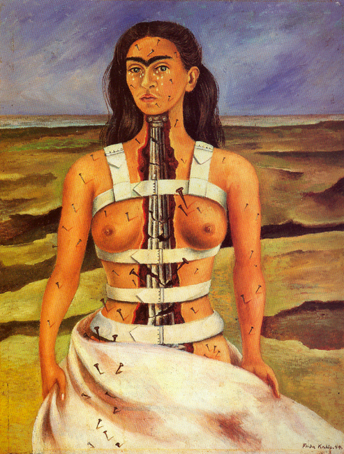 Source: WTL research files. Painting: Self-portrait "La columna rota" (The Broken Backbone), 1944. Comments: With increasing health problems, Frida Kahlo was forced to wear an orthopedic iron corset. In this self-portrait we see images a Greek Ionian column where her spine would be (seen from the front), flathead nails in her body, leather straps holding up the column, a wind-swept cloth skirt, and a parched and broken desert landscape in the background. Humanities Question: When the images are fused, what visual metaphor is being created? |
