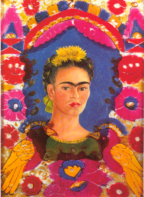 Painting: "Autorretrato 'The Frame'" painted on an aluminum board (1938). The flowers and the birds are painted on crystal and are added as a collage to the painting. The great French art museum, Le Louvre, bought this painting; it was the first canvas by a Mexican artist ever shown at the Louvre.