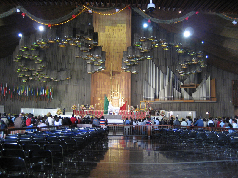Comments: The image of the Virgen de Guadalupe (called la Guadalupana) is straight ahead behind the high altar (el altar mayor) just to our right of the foot of the cross (i.e., where Mary is said to have stood during the Crucifixion). Below la Guadalupana is a large draped Mexican flag. The interior architecture is very modern; construction materials are marble and wood in geometrical patterns. Hanging from the ceiling are large votive lights. Natural light enters this circular nave from stained glass windows and from the church's seven doorways. National flags from Latin America are hanging to the left as we are viewing the altar.