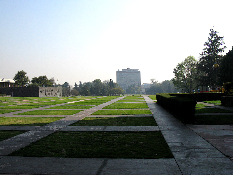 Source: WTL© photograph taken on-site at the UNAM library in Mexico, D.F. (2007). Image: As we continue our counterclockwise tour of the exterior of the library, we look east here across the Esplanada. Look at the map in O'Gorman #1 to identify the location of the central quadrangle. There are more than 180,000 students at the UNAM. The main campus (Ciudad Universitaria) houses the Stadium, 40 facultades (schools or colleges) and institutes, a cultural center, an ecological park, the library, and several museums. Link: The UNAM's main Web pages in => español or =>English. |