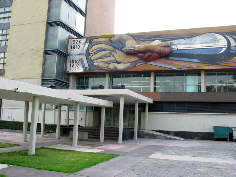 Source: WTL© photograph taken on-site at the UNAM library in Mexico, D.F. (2007). Image: Before continuing our tour of the Central Library's mural, we look right from where the last photo was taken to look at the Torre de la Rectoría (university president's offices): see the map in O'Gorman #1 for its location. The base relief mural over the entrance is by David Alfaro Siqueiros (1896-1974), was was a Mexican social realist (i.e., inspired by Soviet esthetic notions) and muralist, who, along with Rivera, Orozco, and O'Gorman, produced large fresco murals like this one, thereby creating the so-called "Mexican Muralist Renaissance". Humanities questions: What does this mural depict? What does it have to do with a university? To what do the dates refer? How can you tell that the style of this building is in the (international) modernist tradition? |
