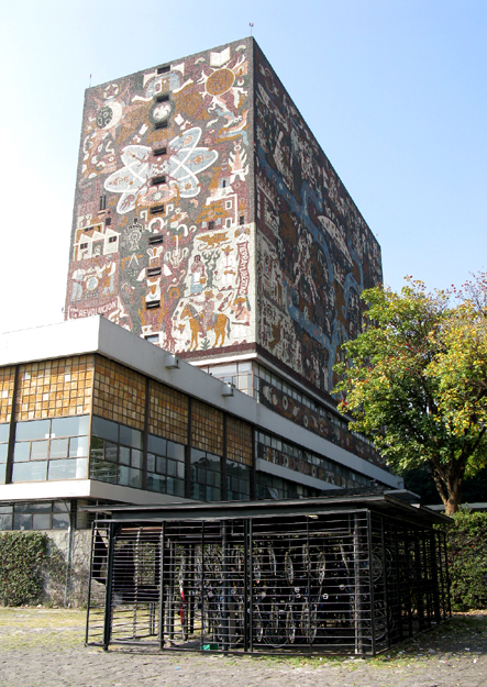 Source: WTL© photograph taken on-site at the UNAM library in Mexico, D.F. (2007). Image: East façade of UNAM's library. This façade depicts the modern world. Humanities questions: What elements show the modern world in this wall's mural? Does the center of this mural remind you of a central element in a mural by another Mexican muralist? Who? Which mural? Where is that mural? |