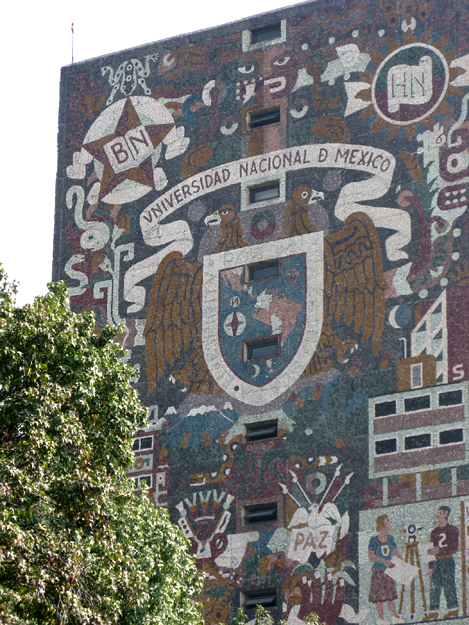 Source: WTL© photographs taken on-site at the UNAM library in Mexico, D.F. (2007). Image: North exterior wall with Juan O'Gorman's murals on UNAM's library. Humanities issues: With this photograph we return to the parking lot thus completing our circular tour of the outside of the library. The north façade depicts the pre-Hispanic world and some symbols of the university itself. Humanities questions: (A) Do you see anything that reminds you of Tláloc (Chaac)? (B) How are these two elements— precontact and modern—related? (C) What pre-Hispanic elements do you see here? (D) In what way is pre-Hispanic Mexico integrated into this great, modern Latin American university? (E) Notice the word in the bottom right quadrant, paz ("peace"), below the white dove, a universal symbol of peace: comment on this element in the mural. |