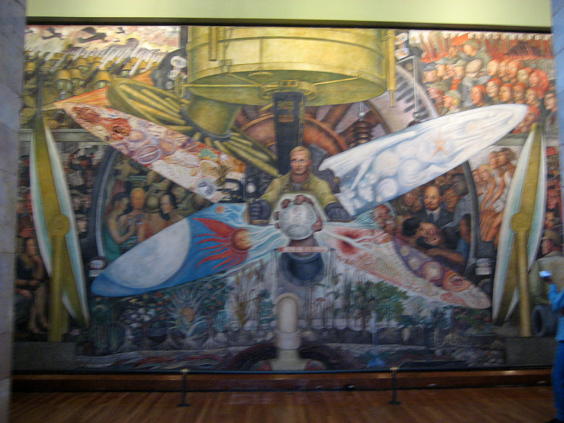Comments: Here is the large central area of the mural. In the center is the Man, who is seen controlling machines, science, and technology. The two ellipses that cross diagonally behind the Man are like propellers, and the man is dressed like a pilot with gigantic mechanical wheels behind him. The ellipses represent the biological microcosm (in the Man's right side; our left) and the macrocosm of the stars and universe (on the Man's left side, our right). Below the Man are plants and fruits growing from the earth.