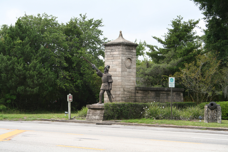 Source: WTL photograph© 2007. Image: Here you see one side of the new gateway on the north side of St. Augustine on route A1A . The photographer-professor is facing southwest and standing with his back to the entrance to the short street that leads through a small residential neighborhood at the end of which is the entrance to the Fort Mose Historic State Park of Florida. Question: By means of the images St. Augustine as constructed here and parallel ones you see in this photo, what are the modern authorities (and citizens?) of St. Augustine explicitly and/or unconsciously communicating to travellers and visitors who pass through these (symbolic) gates? For the old Spanish city gates, see => the St. Augustine pages. |