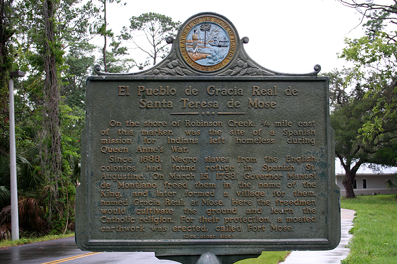 Comments: Most, but not all, of the information on this sign is accurate. Actually, the Spanish Indian mission was much closer to the walls of old San Agustín. The site here at Mose was designated specifically for blacks, both free and slave. Furthermore, it is accurate to say that all black slaves who escaped from the (Anglo-) American colonies to Spanish Florida were instantly given legal freedom provided they converted at least nominally to Catholicism, which they all instantly did. This political fact created immense friction between Spanish Florida and the English slaveholders in the English colonies. Ultimately, it is one of the principal causes--but not the only one--for the collapse of Spanish Florida. When Thomas Jefferson was President he, too, as a slaveholding Virginian, forced Spain to modify its policy of granting freedom to English colonial slaves escaping to Florida. When this change occurred, many black slaves moved west into the interior of the Florida peninsula where the sought and got refuge among the remaining Timucuan Indians, who were more or less allied with the Spanish government. In turn, this movement of black slaves to Alachua and surrounding counties caused new invasions from whites and their own Indian allies in America's southern colonies, thus bringing about the end of both Timucuan culture and, until 1865 or 1963, free black culture.